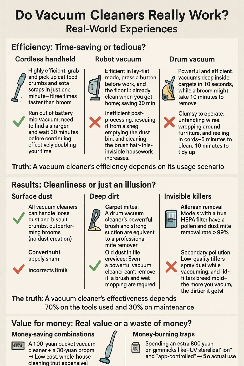 Armadilhas para queimar dinheiro: ► Gastar 800 yuans extras em truques como "esterilização UV" e "controlado por aplicativo" → ≈ 0 uso real. ► Um aspirador sem fio de última geração custa 600 yuans para substituir a bateria após 3 anos → Melhor comprar apenas um novo.