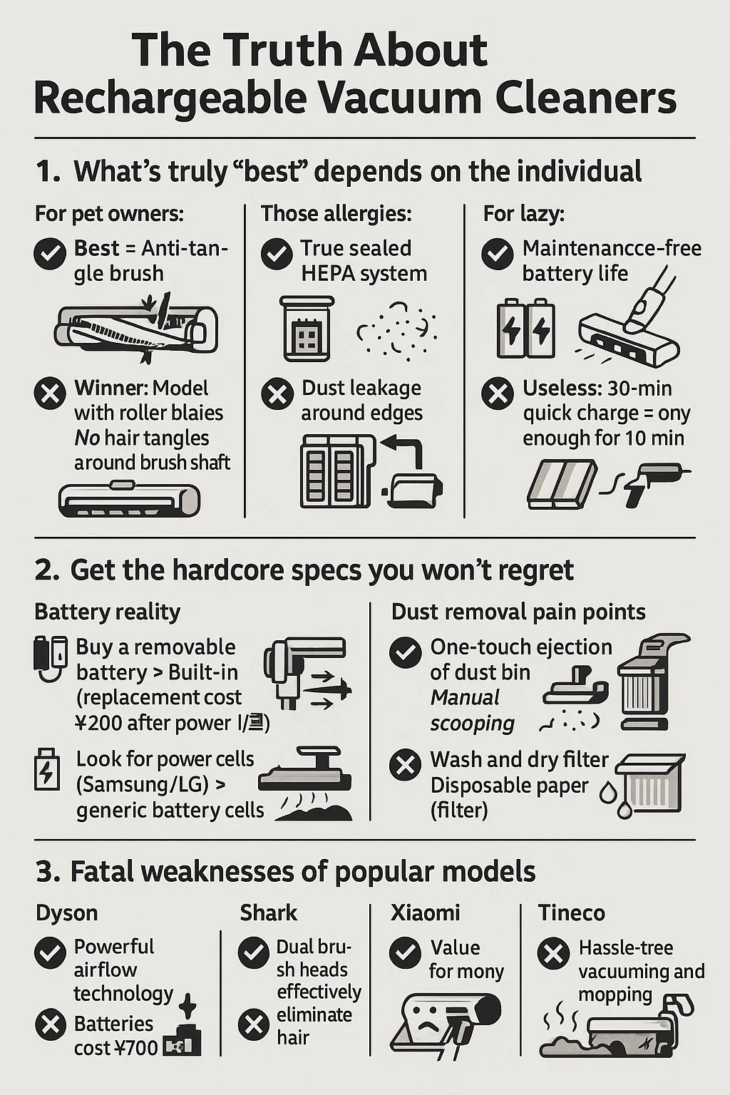 Para os preguiçosos: "Melhor" = duração da bateria sem manutenção. Vencedor: Baterias duplas hot-swap (substituídas instantaneamente quando descarregadas). Inútil: carga rápida de 30 minutos = apenas o suficiente para 10 minutos de aspiração.